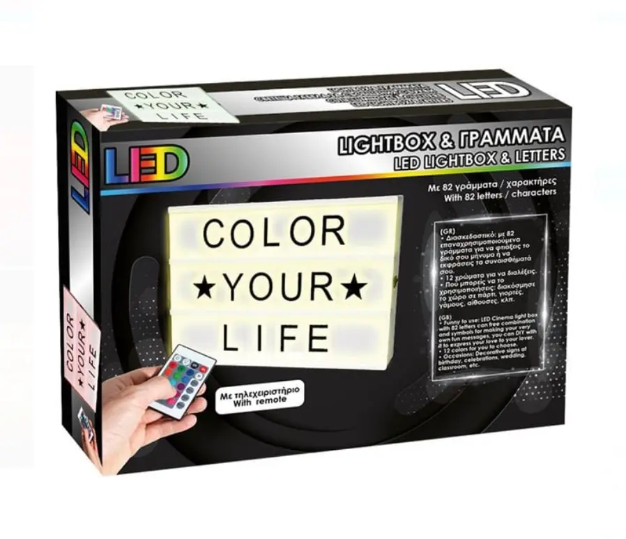 Lampa Lightbox RGB cu lumina LED si 82 de litere si simboluri pentru a va crea propriul mesaj sau pentru a va exprima sentimentele. Iluminarea este de 12 culori care pot fi alese de la telecomanda. Poate fi montat pe un perete sau pe o suprafata plana si este perfect pentru a fi folosit la petreceri, sarbatori, nunti si alte evenimente. Functioneaza cu 6 baterii AA (neincluse).