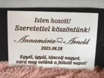 Personalizat cu numele mirilor și data evenimentului – de exemplu: Annamaria & Arnold – 2025.06.28 – acest decor devine un element unic și special. Mesajul atent ales adaugă un plus de emoție și autenticitate, fiind ideal pentru a fi amplasat la intrarea în locație.