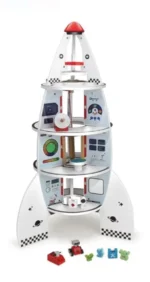 Set activitati din lemn in forma de nava spatiala. Joc de rol intergalactic perfect pentru a crea povesti cu copilul dumneavoastra despre expeditii pe planete indepartate, unde va asteapta extraterestri amuzanti si tari ciudate!