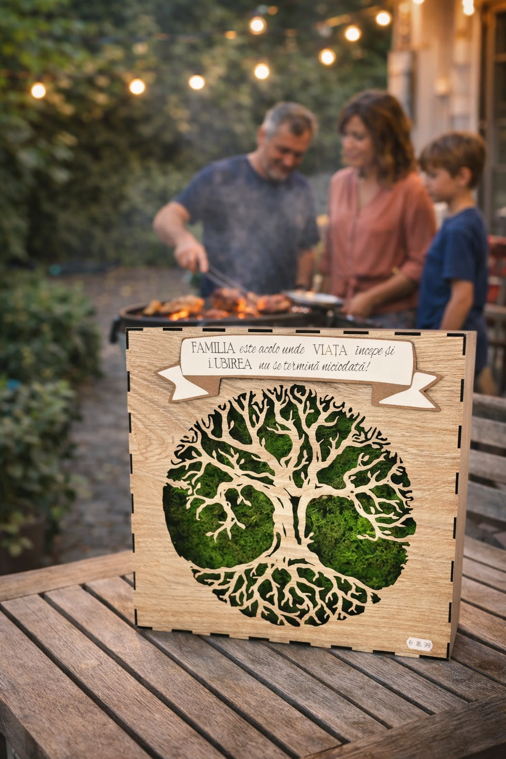 Designul elegant, combinat cu mușchi natural și mesajul emoționant despre familie, îl transformă într-un simbol al iubirii și al unității.