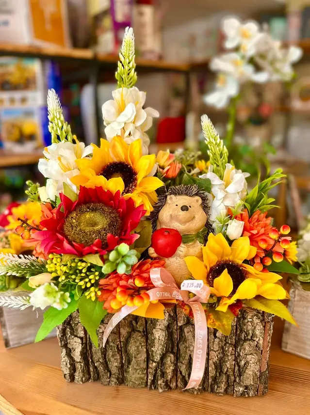 Un aranjament floral plin de culoare, cu flori galbene, roșii și albe, așezate într-un suport rustic din scoarță de copac. În mijloc se află o figurină simpatică de arici ce ține un măr roșu, adăugând un farmec jucăuș și cald, perfect pentru a înveseli orice încăpere.