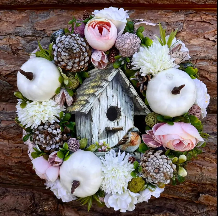 O coroniță rustică, cu o căsuță de păsări veche în centru și un mic păsărel pictat pe margine, este decorată cu dovlecei decorativi albi, trandafiri roz pal, crizanteme albe și conuri de brad argintii. Frunzele verzi și detaliile naturale creează un aranjament fermecător, perfect pentru a aduce un aer cald și de poveste ușii de la intrare.