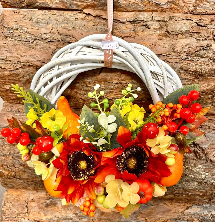 Această coroniță de toamnă are o bază albă împletită și este împodobită cu flori roșii și galbene, frunze verzi și arămii, precum și fructe de pădure roșii și portocalii. Dovlecei decorativi și mici ciupercuțe adaugă un aer rustic.